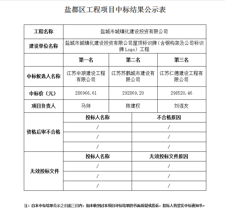 鹽城市城鎮(zhèn)化建設(shè)投資有限公司屋頂標(biāo)識牌(含鋼構(gòu)架及公司標(biāo)示牌Logo)工程中標(biāo)公示