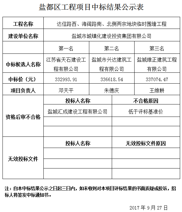 達(dá)信路西、海闊路南、北側(cè)兩宗地塊臨時(shí)圍墻工程中標(biāo)結(jié)果公示